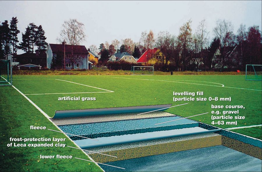 Drainage is only one consideration for landscape architects when they plan a sports facility, but it is a very important one. In wet weather conditions, its effectiveness determines whether the new pitch is playable. In the drainage layer, the kidney-shaped to granular form of expanded clay ensures good drainage and simultaneously absorbs a certain amount of moisture which is released again as needed, for example, in dry conditions.