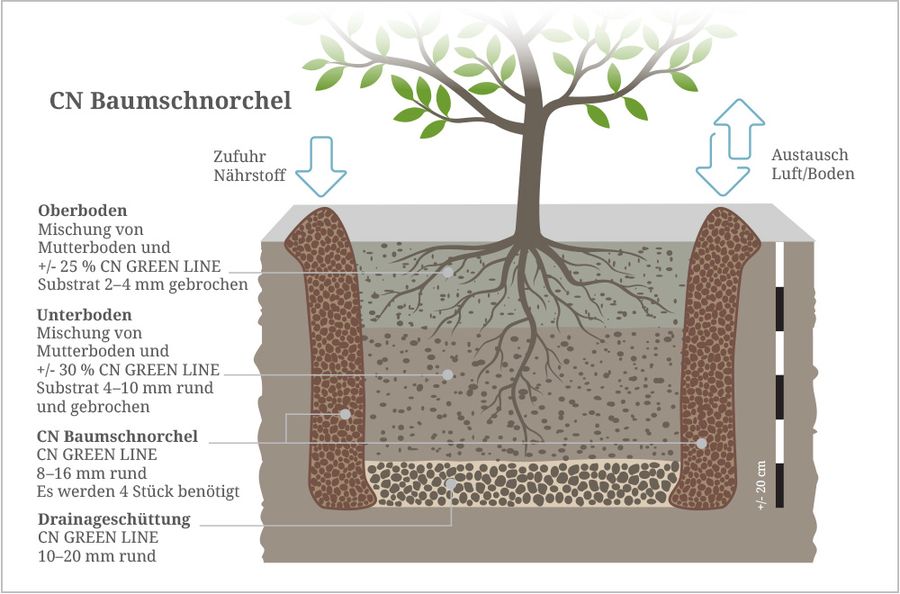 The tree snorkel contains a mixture of different sized grains of expanded clay. The expanded clay is open-pored, structurally stable and provides reliable protection against soil compaction, permitting optimum supply of oxygen and water to the roots thanks to the special distribution of the pores. The tree snorkel’s high air entrainment specifically promotes the soil-gas exchange and thus the nutrient supply and growth of the roots. Four tree snorkels are required per tree.